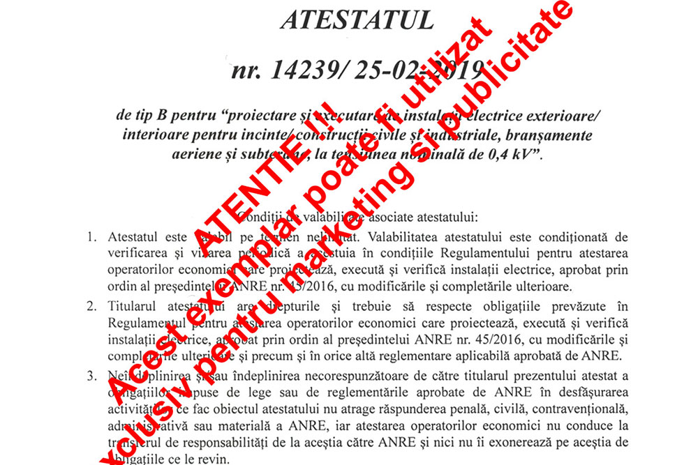 – Lucrari de proiectare si executare de instalatii electrice exterioare / interioare pentru incinte / constructii civile si industriale, bransamente aeriene si subterane, la tensiunea nominala de 0,4kV;