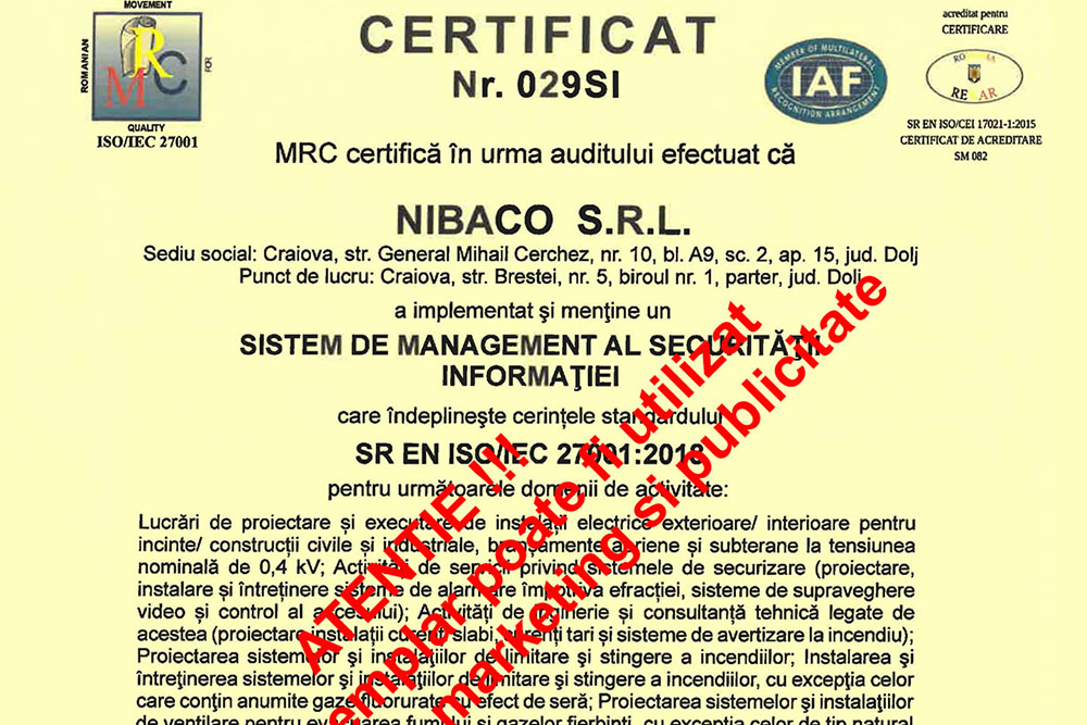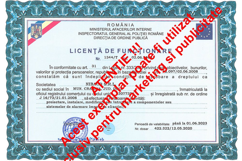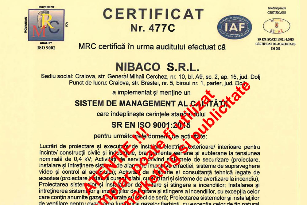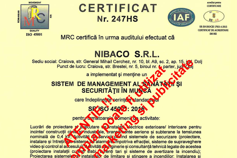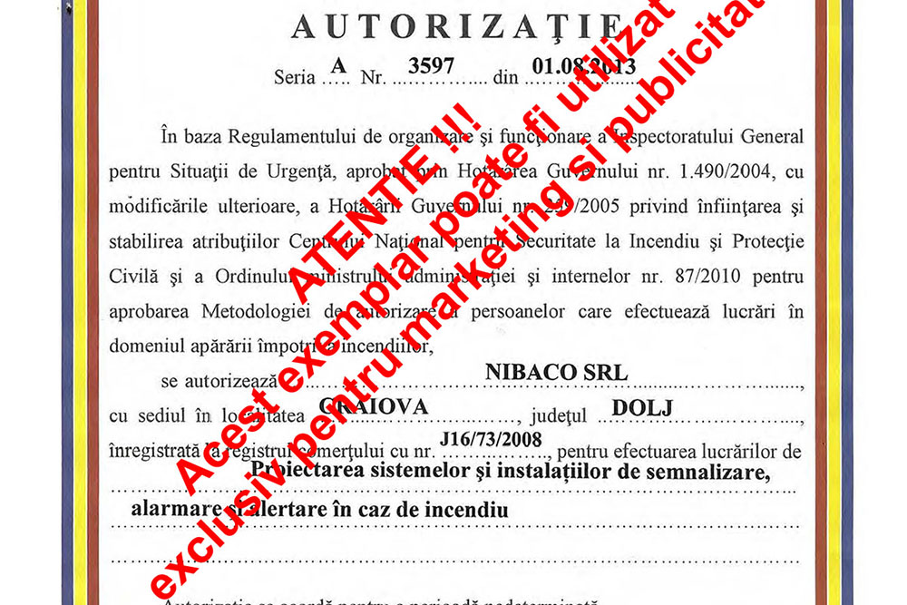 Compania Nibaco dispune de autorizatii, licente, atestate si certificari aferente serviciilor integrate de securitate si siguranta oferite, de la sisteme detectie incendiu, desfumare, stingere incendiu, sonorizare, detectie efractie, supraveghere video, control acces, videointerfonie si pana la sisteme de iluminat de siguranta sau cablare structurata. Activitatea noastra se bazeaza pe incredere, calitate si profesionalism pentru toti clientii ce apeleaza la serviciile noastre integrate de securitate si siguranta.