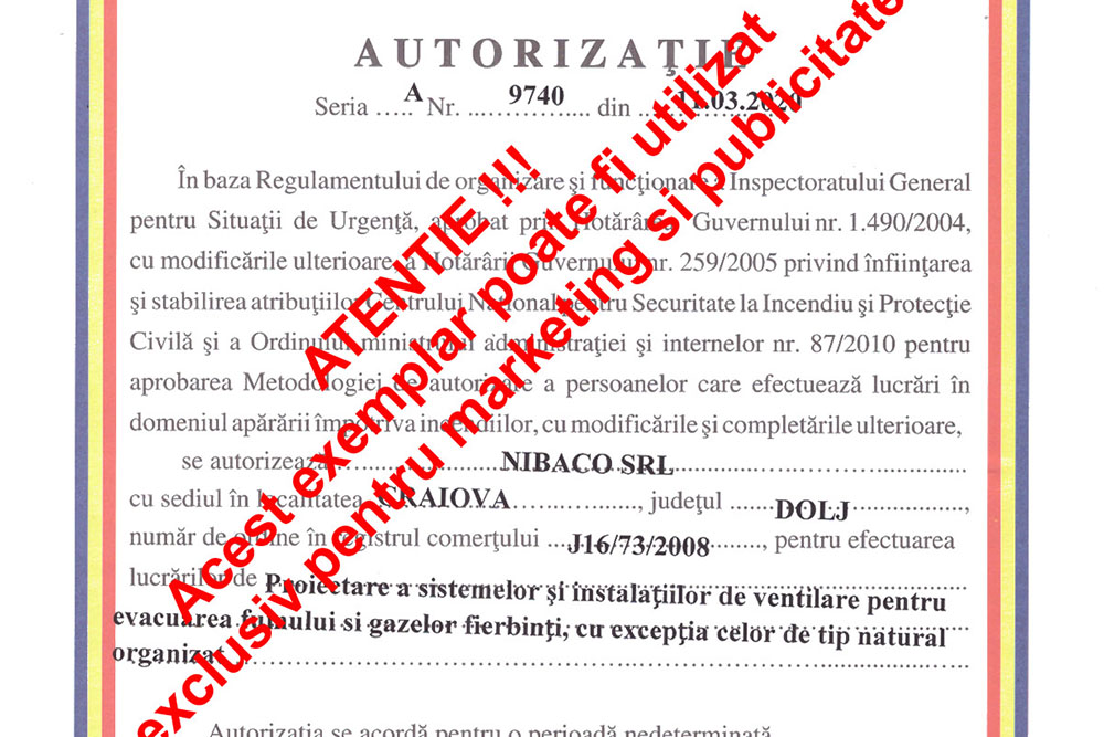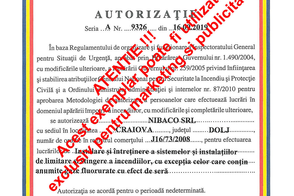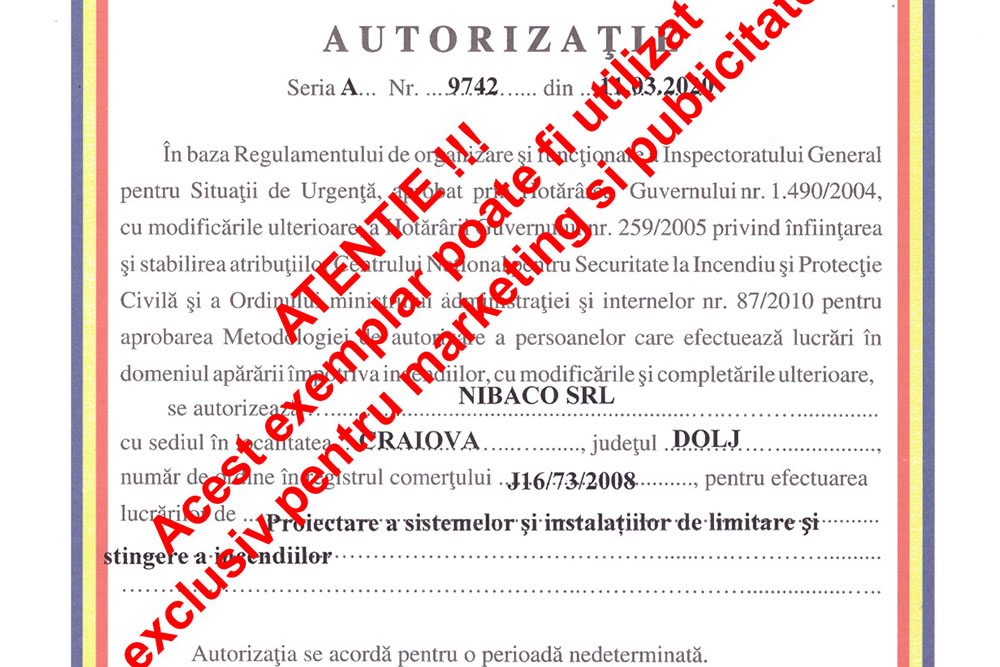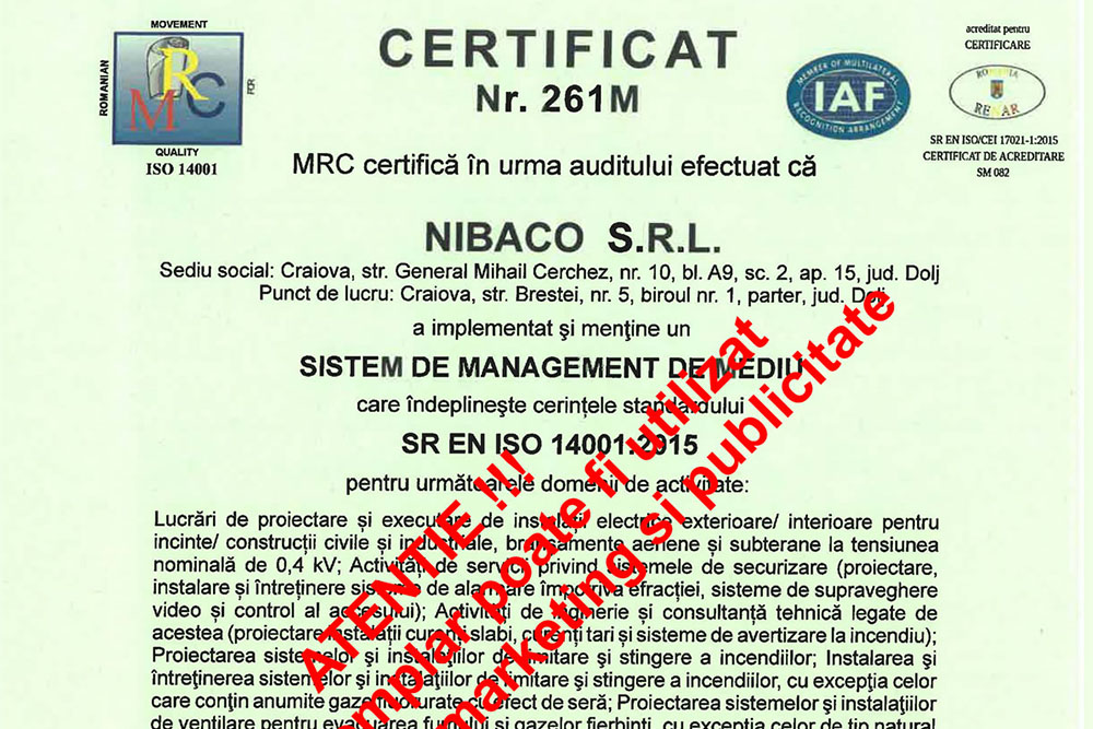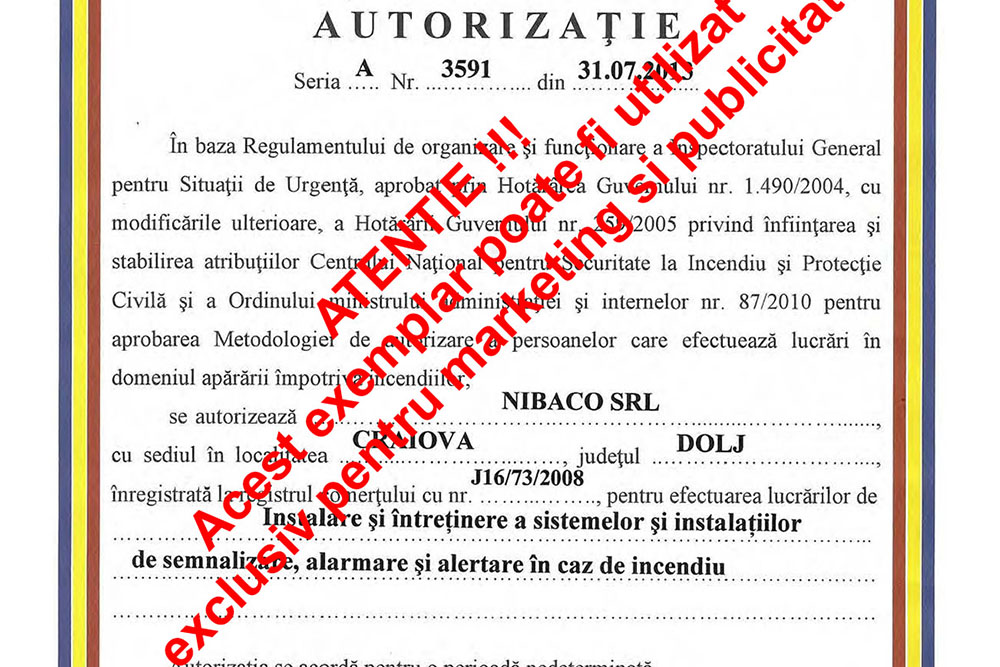 Compania Nibaco dispune de autorizatii, licente, atestate si certificari aferente serviciilor integrate de securitate si siguranta oferite, de la sisteme detectie incendiu, desfumare, stingere incendiu, sonorizare, detectie efractie, supraveghere video, control acces, videointerfonie si pana la sisteme de iluminat de siguranta sau cablare structurata. Activitatea noastra se bazeaza pe incredere, calitate si profesionalism pentru toti clientii ce apeleaza la serviciile noastre integrate de securitate si siguranta.