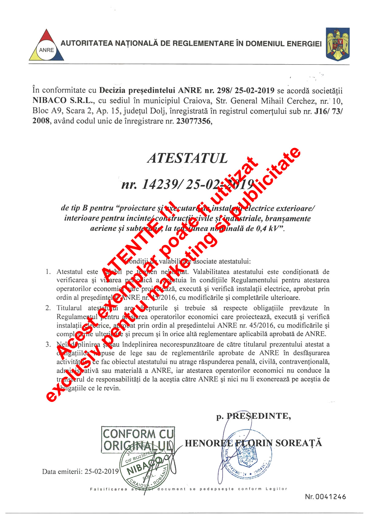 – Lucrari de proiectare si executare de instalatii electrice exterioare / interioare pentru incinte / constructii civile si industriale, bransamente aeriene si subterane, la tensiunea nominala de 0,4kV;